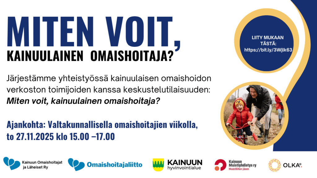 Järjestämme torstaina 27.11.2025 klo 15.00 – 17.00 Kainuun alueen ”Miten voit, kainuulainen omaishoitaja ? -tilaisuuden.